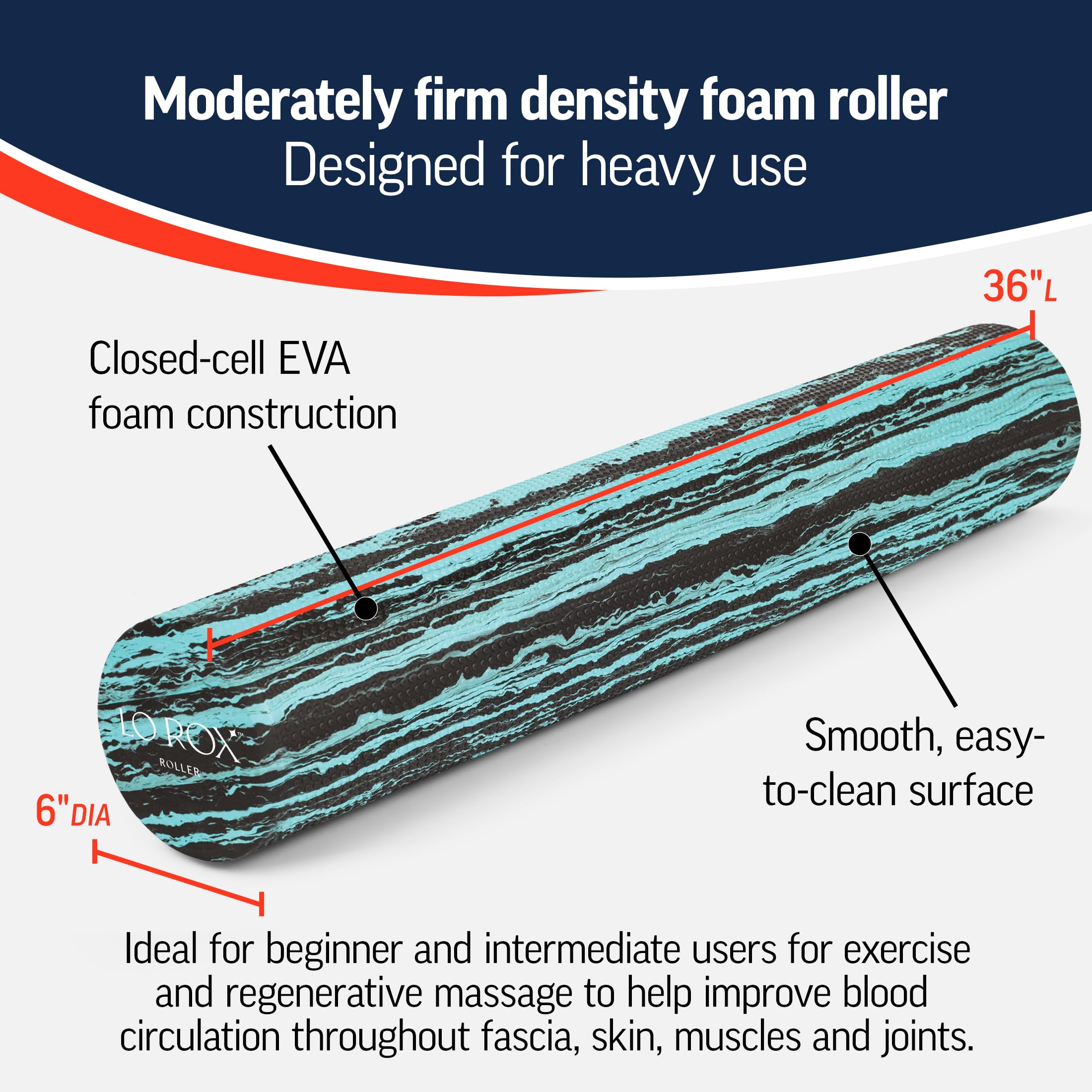 - 36 Inch Foam Roller: This full size foam roller measures 36" long x 6" diameter and is designed to help elongate the muscles, tone the body and improve blood circulation throughout the fascia, skin, muscles and joints through self-massage and exercise.