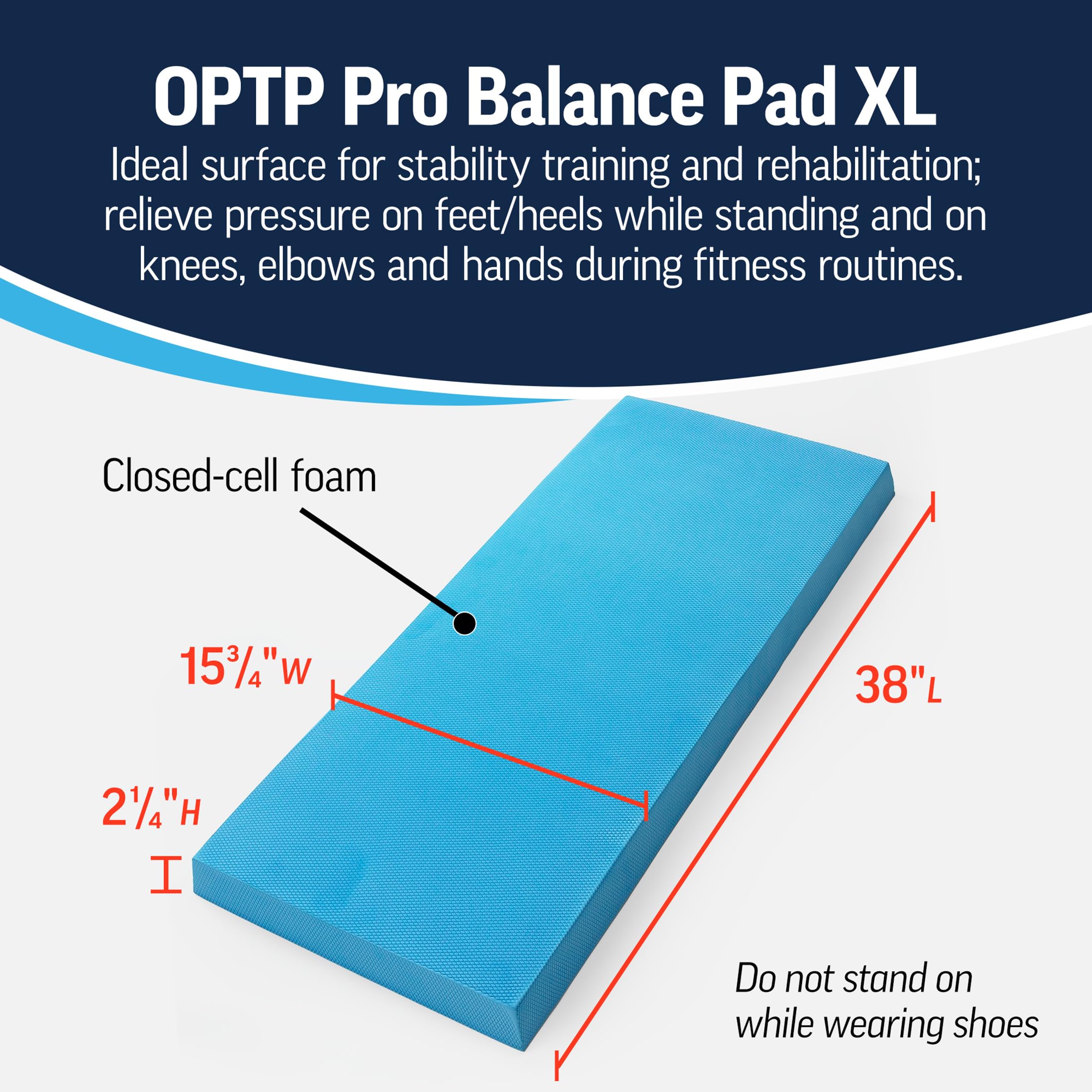 - Measurements and Specs: The OPTP Pro Balance Pad XL is 38" long x 15.75" wide x 2.25" high. Use in the clinic or at home, by itself or with a standing desk.