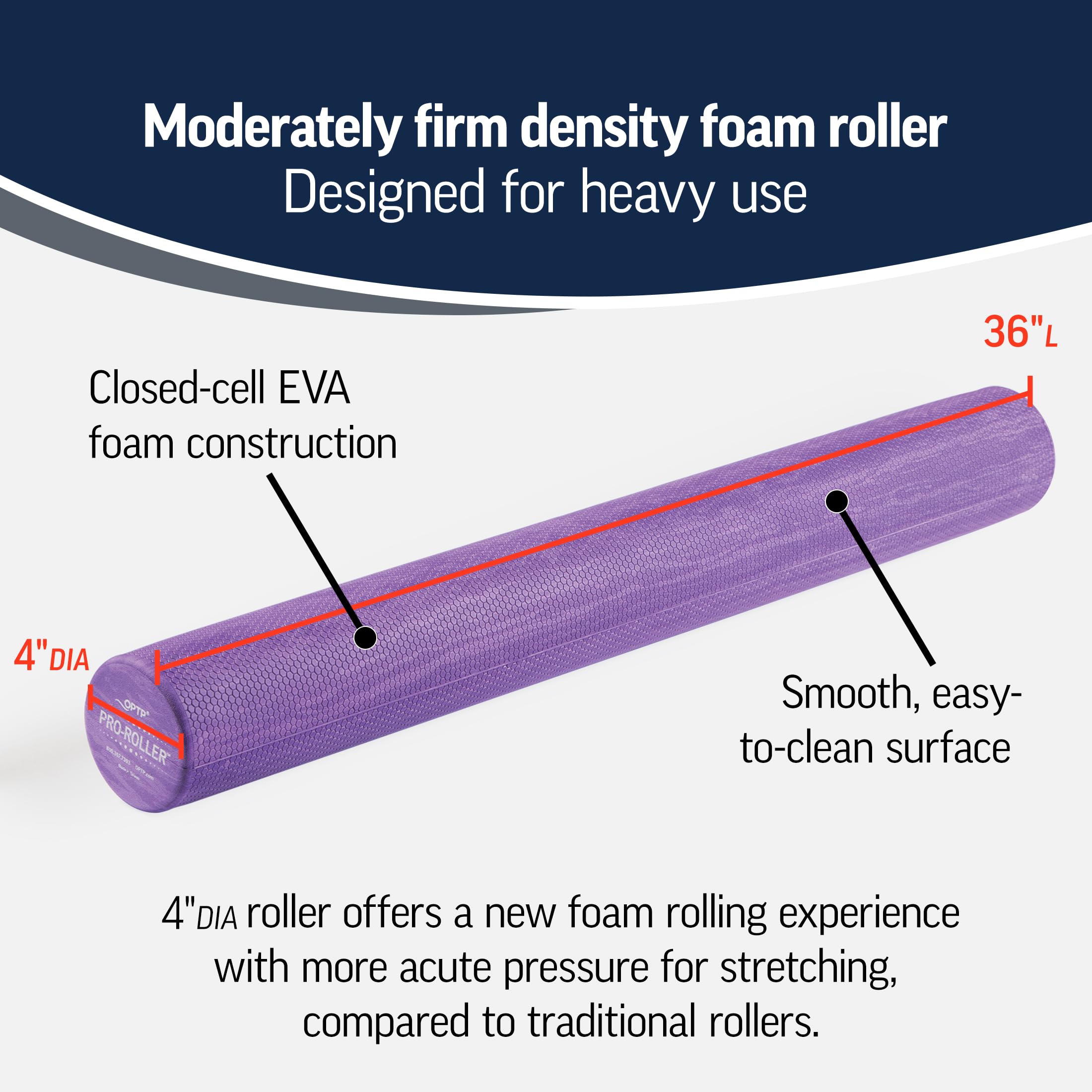OPTP PRO-Roller Standard Density Foam Roller – Medium Density Foam Roller for Physical Therapy, Pilates, Yoga Foam Roll Exercises, and Muscle Recovery - Purple 36" x 4"
