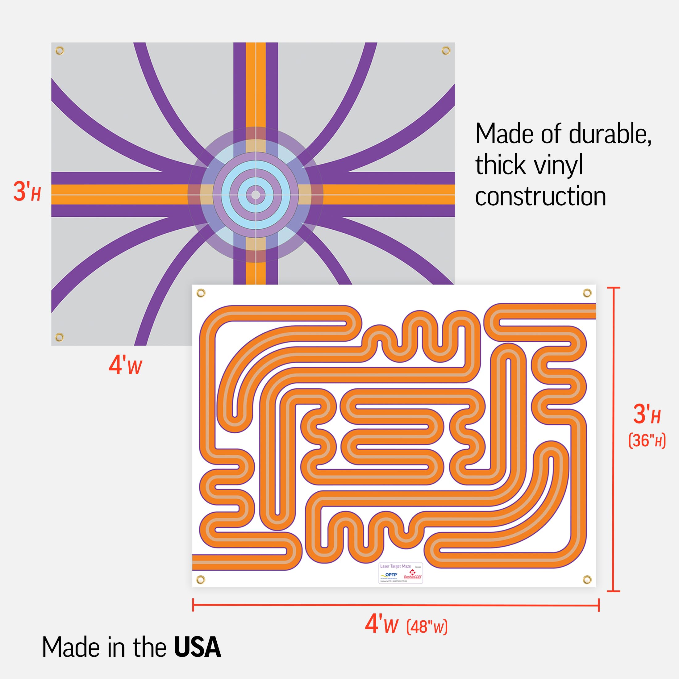 - SenMoCOR Posters: The SenMoCOR System includes two posters. The Laser Target Maze poster features a winding maze for cervical motor control. The Laser Target Cross poster features a circular target with vertical, horizontal, and arced lines for tracking. Each poster is made of durable vinyl and measures 4' wide x 3' high.