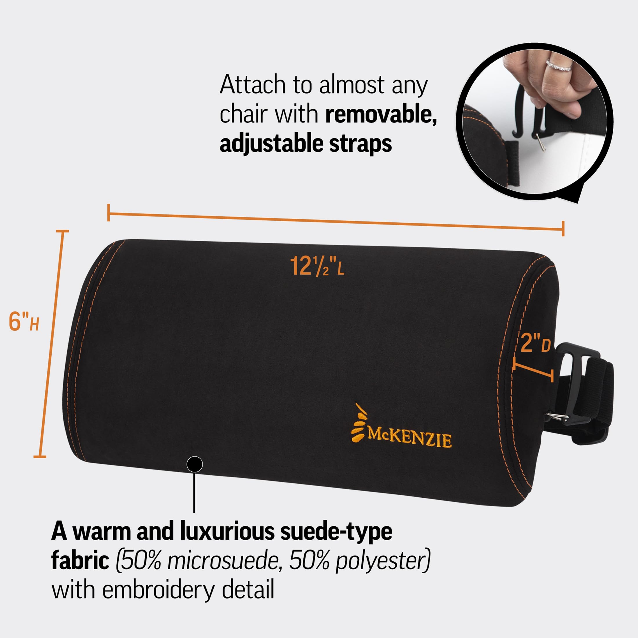 - McKenzie Method: Developed by renowned Physical Therapist Robin McKenzie, the Signature Series of lumbar rolls feature a warm and luxurious suede-type fabric and removable, adjustable straps.